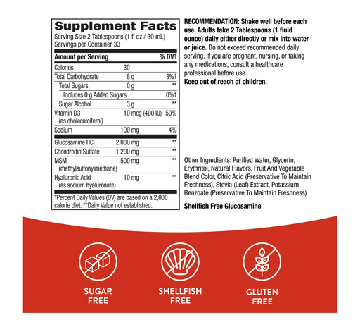 Features: Glucosamine 2000 mg., Chondroitin 1200 mg. MSM 500 mg., Hyaluronic Acid 10 mg. Fast Absorbing Berry Flavor Liquid Shellfish Free, Gluten...