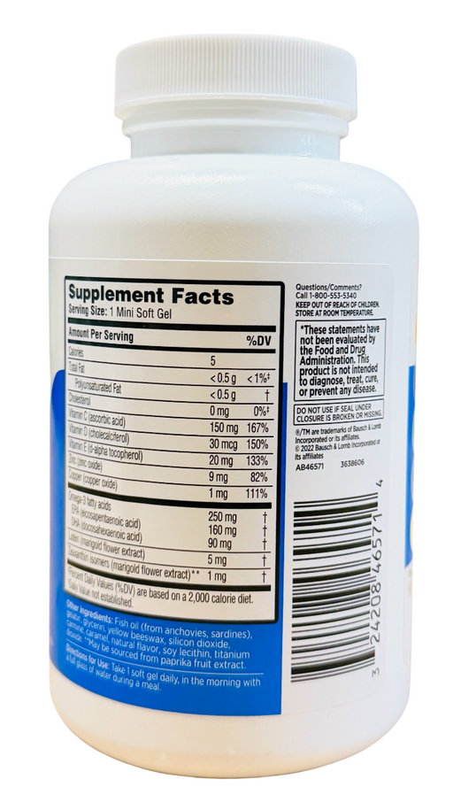 Features: Vitamin and mineral supplement for the eye with Lutein, Zeaxanthin and Omega-3 One mini gel per day. EXP 02/2027